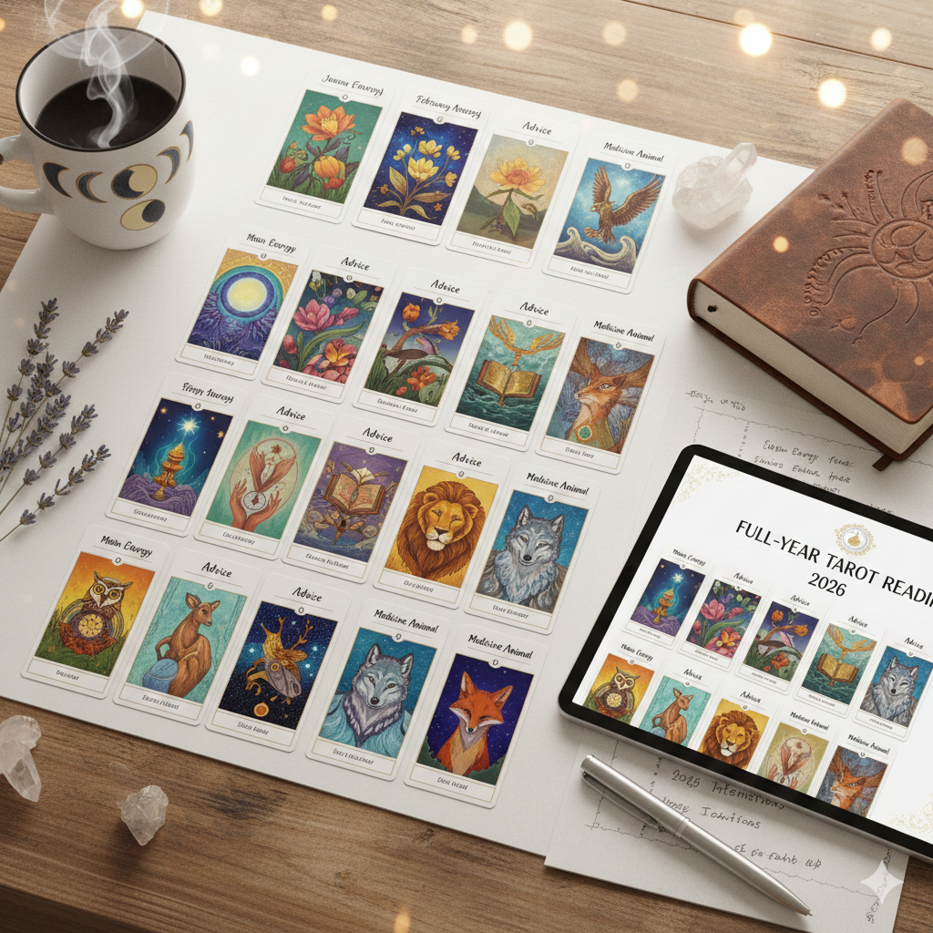 Esta lectura de tarot de un año completo ofrece orientación para cada mes de 2026 con tres cartas extraídas por mes para Claridad, intención y apoyo. Al comprender la energía principal , recibir consejos y conectar con tu animal de medicina cada mes, podrás saber: